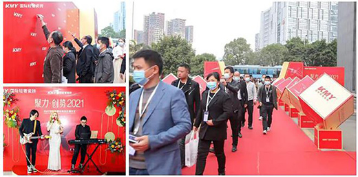KMY品牌2021全矩陣新品吸睛亮相,新概念、新花色、新工藝和新空間展示設計方式悉數呈現,獲得現場KMY經銷商的大加贊賞。