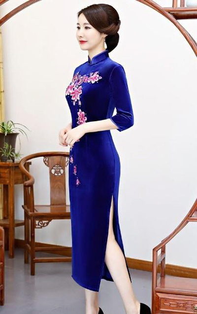 推薦的第二條旗袍有兩種顏色,一個是藍色,另一個是勃艮第色,藍色天鵝絨旗袍不僅是藍色的,也作為面料的底色使用,實際上,藍色本身會變得更加突出,和紅色的組合會顯得更加時尚美麗,天鵝絨質地的特征是外觀光滑柔軟,手感柔軟,有著松軟的溫暖,七點的袖子和長款設計在保溫方面也很出色,因此,這種天鵝絨質地的旗袍很適合秋冬。