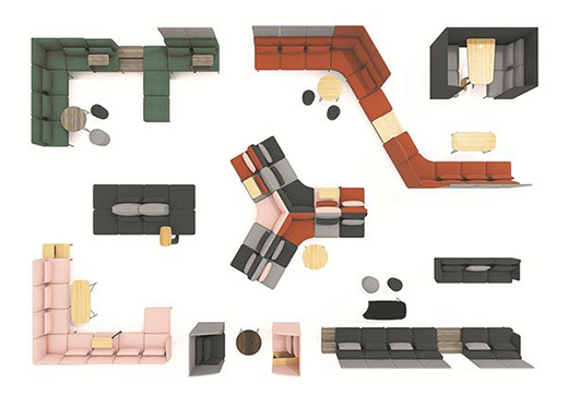 Puffy可配備電源、USB插口和茶幾桌板等配件,支持協作交流或獨立專注辦公。模塊化的設計適用于不同空間布局,適用于大廳、接待前臺、社交、放松等各類共享空間,營造各種人性化開放的情境,提升辦公效率。