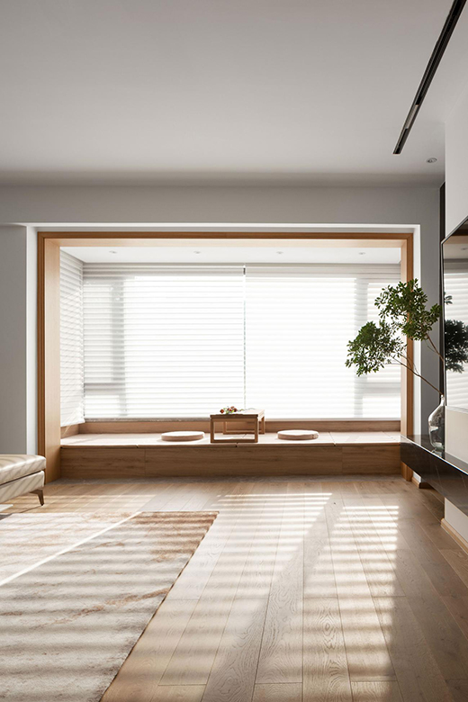 窗簾對室內格調的影響很大。本案擁有270°的真觀景飄窗,如直簾就會浪費掉很大一塊面積。設計師王明治選擇了香格里拉簾,百葉的形狀可以完美匹配窗戶的尺寸,也讓室內空間顯得更大。