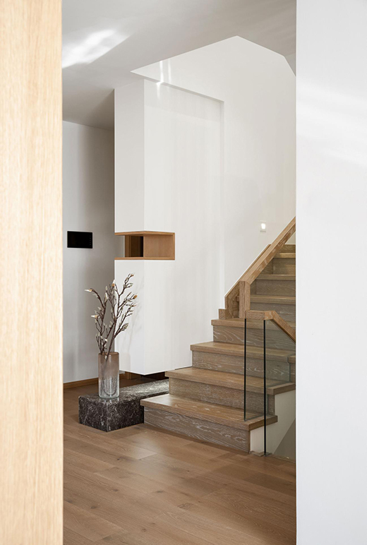如果在現代聯排別墅中加入一個佛堂,會顯得既突兀又不實用。一個嵌入式佛龕,既表達了虔誠之心,又豐富了立面的材質細節,可謂巧思。小中見大,打開玻璃門就可以誠心禮佛。