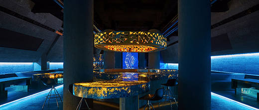 最后采用了泡沫鋁板的未來感和巖石質(zhì)感,與抽象的原始感吻合。藍(lán)色的氧化鋁板來源于湖水的意象,它具有一種神秘的光澤感。地面采用的火山巖片石,與洞穴相關(guān)聯(lián)。玻利維亞藍(lán)透光石如龍王的寶石,透著神秘的光芒。手工脫膜的混凝土吧臺基座帶出幾分力量與原始感,這與玻利維亞藍(lán)寶石般的光芒相得益彰。空調(diào)在洞穴兩側(cè)傾斜的壁面里,兩側(cè)燈光集中在傾斜的巖壁低處。中心部位的燈光以突顯龍王的桂冠和LED屏的光影。