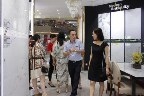 在羅馬利奧瓷磚體驗店,設(shè)計團在門店工作人員帶領(lǐng)下參觀了解